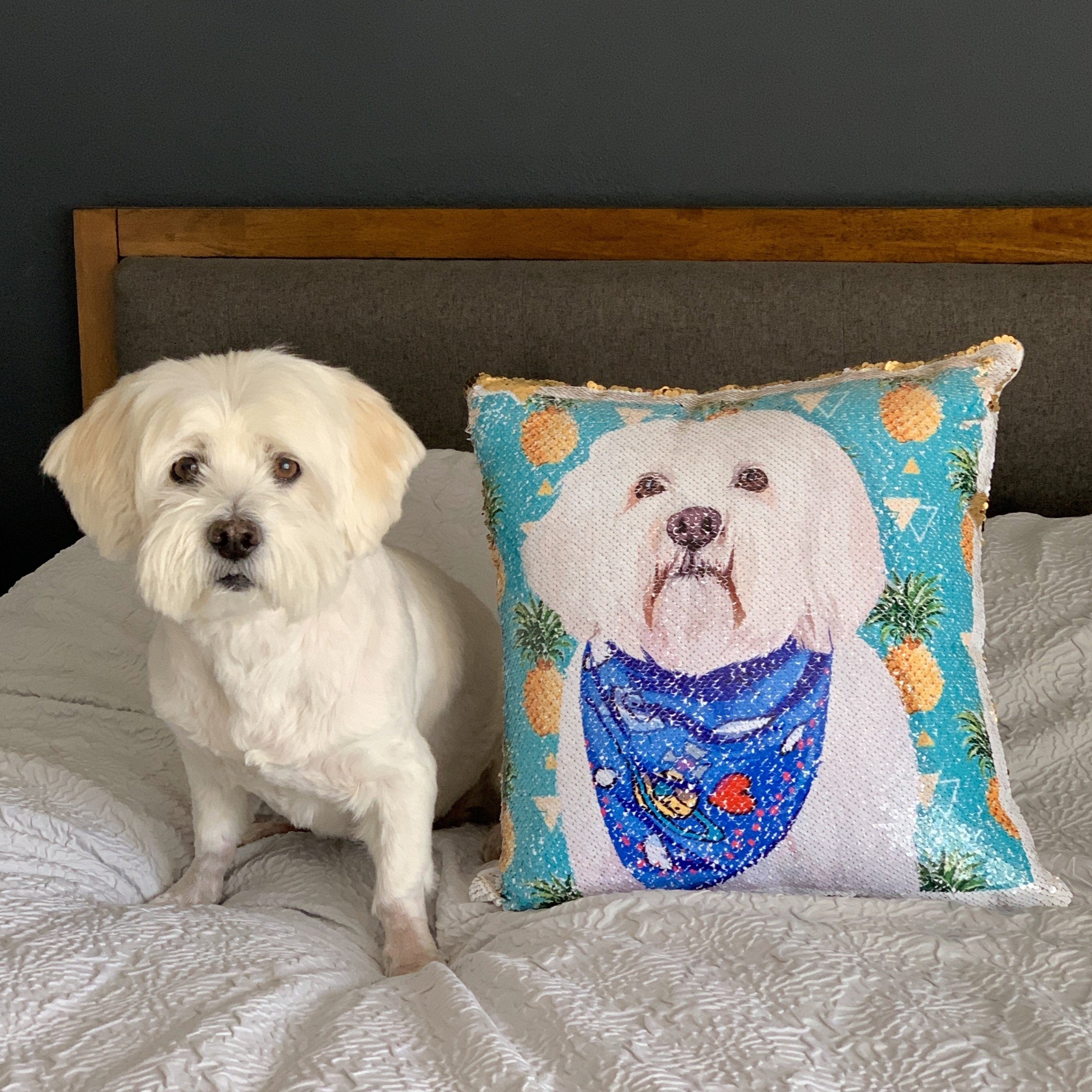 Wow this pillow makes a statement. The reversible sequin is amazing and intriguing. got so many compliments on it. Sequin actually feels luxurious and very comfortable on skin. printing quality is great graphic looks exactly like my dog's photo i sent them. Note: my dog just had a haircut so he appears to be slimmer here. This pillow was so nice I ordered a second one! A great gift to any dog owner. Highly recommended!