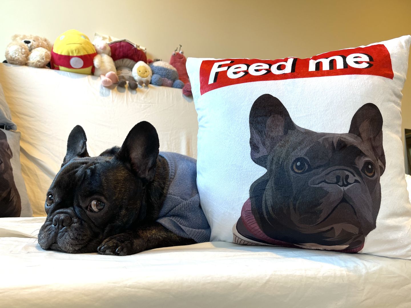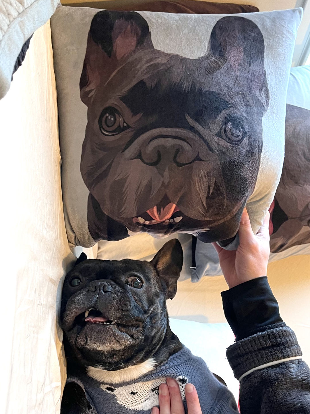 Can’t love them more! The pillows match perfectly in our room decor and they are so funny. Every friend visited our house was asking where did you get these cute stuffs?? The artwork of these pillows was so amazing. They made them just look like exactly the same as our Frenchie and also captured the cutest faces we love!! LOVE LOVE LOVE!!!