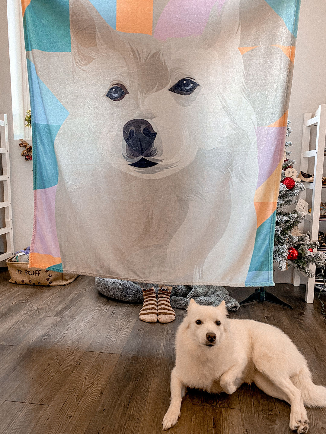 How cute is this! Now I can cuddle with my dog in this blanket :) The drawing is very lively and I love the color background that the artists added. It really make the blanket seems more fun and cozy. The quality is super nice, its soft and warm. I have washed it twice now and so far the color is still perfect and clear. Would hgihly receommed!